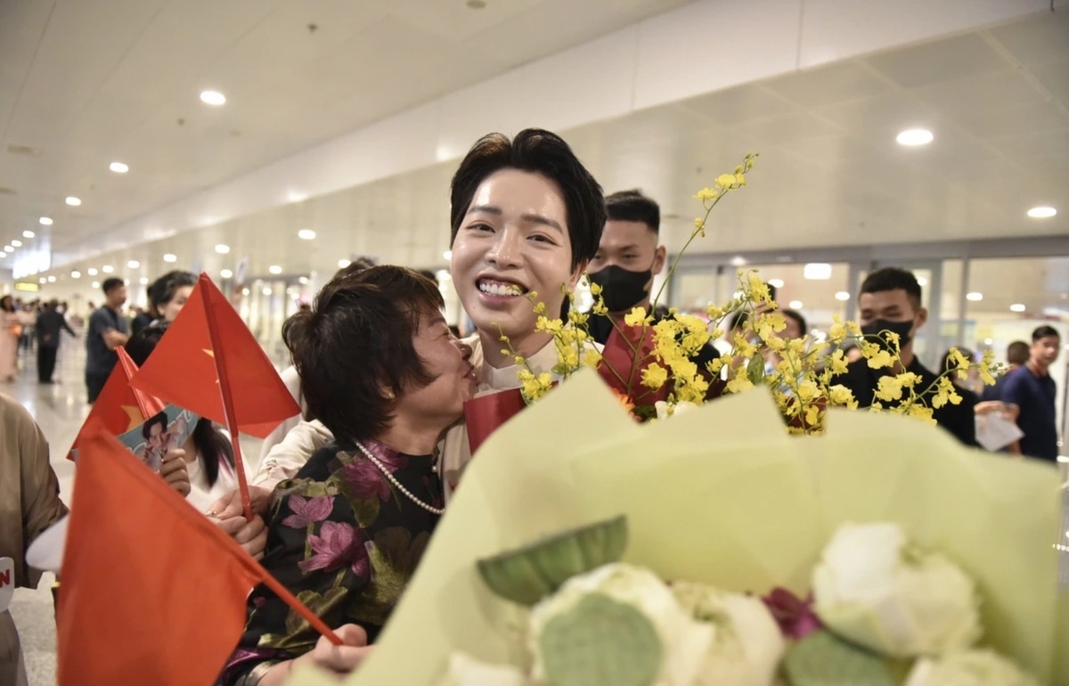 Để đón Đức Phúc trở về Việt Nam sau chiến thắng, bố mẹ của nam ca sĩ được nhiều người hâm mộ vây quanh chúc mừng. Nhiều khán giả cũng có mặt từ sớm tại sân bay, cầm hoa và cờ đỏ sao vàng để chào đón quán quân Intervision 2025.