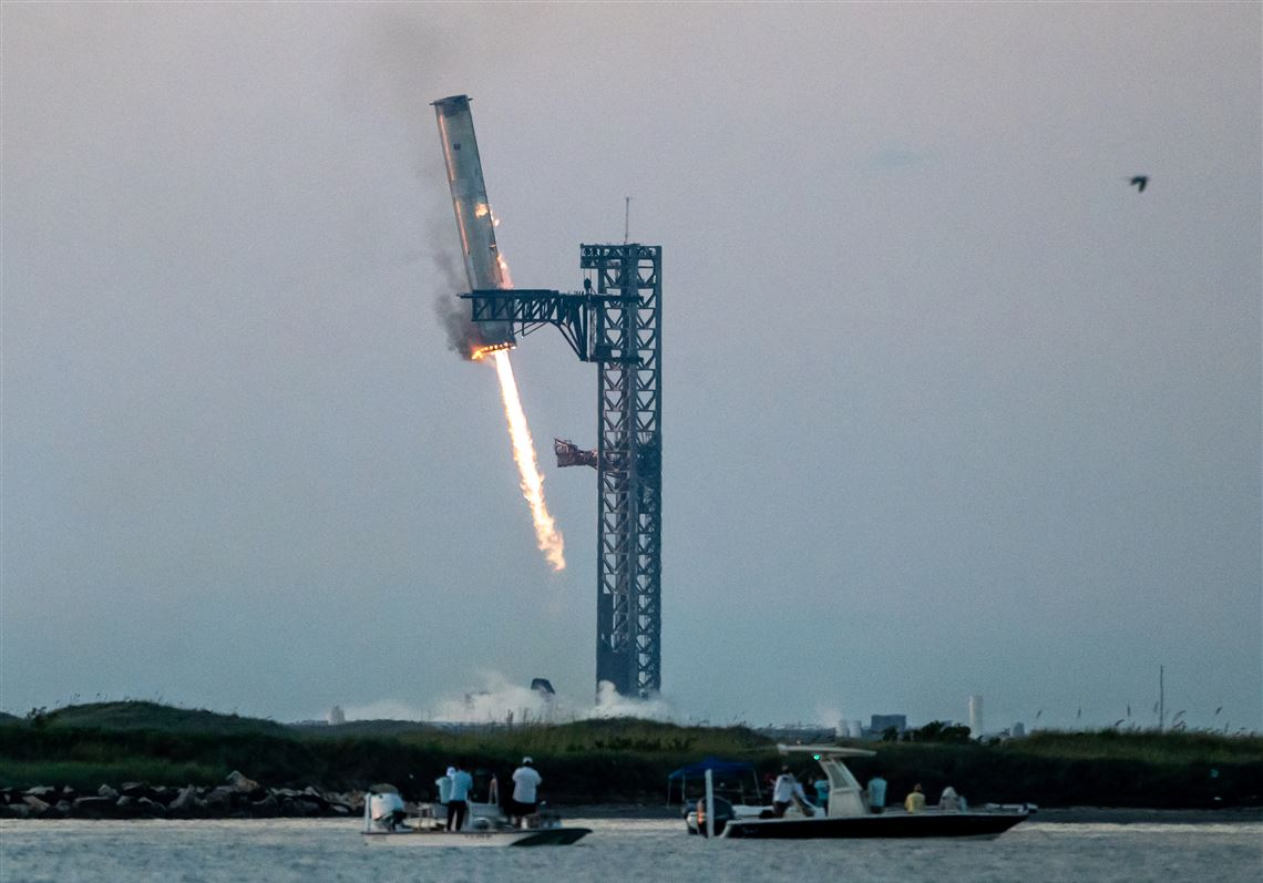 Khoảng 7 phút sau khi cất cánh, tầng đẩy Super Heavy của SpaceX đã thực hiện cú hạ cánh chính xác, lơ lửng gần tháp phóng Mechazilla khi tháp này dùng cánh tay kim loại để giữ chặt nó.