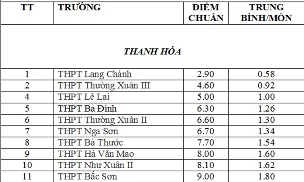 Đặc biệt, có những trường điểm chuẩn nằm ở “đáy”, học sinh chỉ đạt trung bình dưới 1 điểm/môn vẫn trúng tuyển. Điển hình là trường THPT Lang Chánh (huyện Lang Chánh) có điểm chuẩn là 2,9 điểm cho 3 môn thi (Toán, Văn, Ngoại ngữ). Trong đó, điểm Toán và Văn nhân hệ số 2. Như vậy, thí sinh chỉ cần đạt trung bình 0,58 điểm/môn đã trúng tuyển vào trường này.