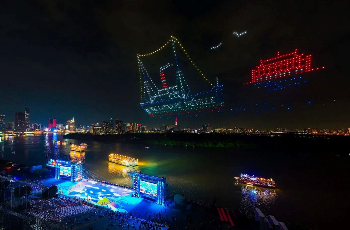 1.100 drone trình diễn ánh sáng nghệ thuật xếp thành các biểu tượng đặc trưng của TP.HCM, truyền tải thông điệp về thành phố tràn đầy năng lượng và sức sống.
