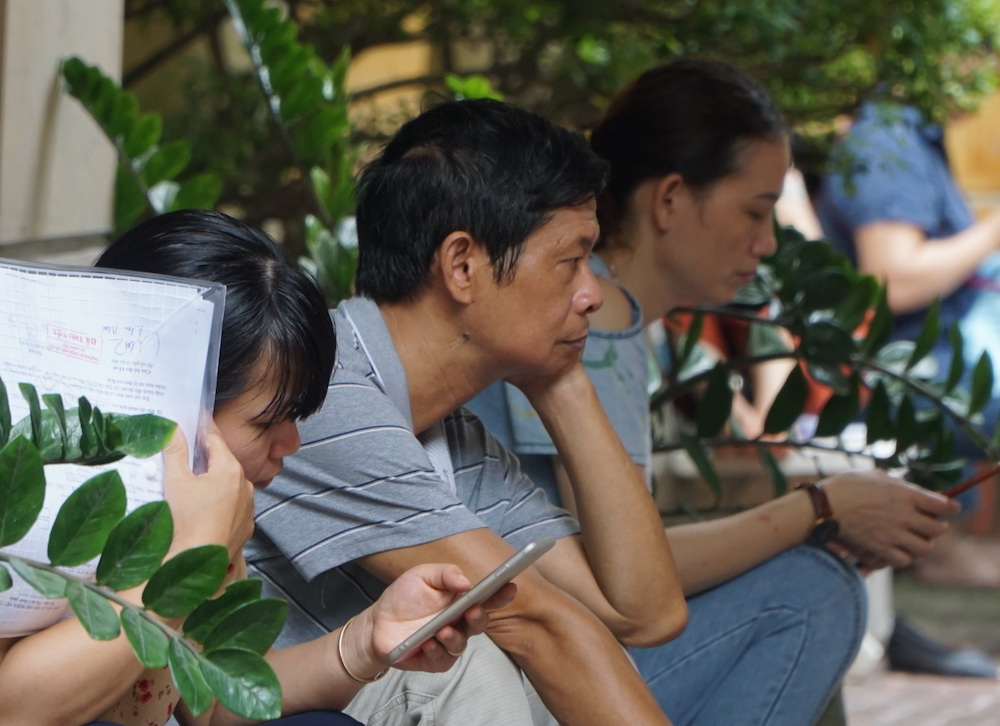 Phụ huynh vừa ngồi đợi con vừa tranh thủ trao đổi với nhau để giảm bớt căng thẳng.