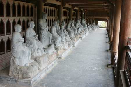 Bên trong hai dãy hành lang đặt 500 pho tượng La Hán, mỗi tượng cao từ 2m - 2,5m, nặng khoảng 2 tấn đến 2,5 tấn, có hình dáng, thần thái, tâm trạng khác nhau, nhưng đều thể hiện chí khí bất diệt, cao cả của nhà truyền đạo, được tạc bằng đá nguyên khối lấy tại xã Ninh Vân, huyện Hoa Lư, tỉnh Ninh Bình.