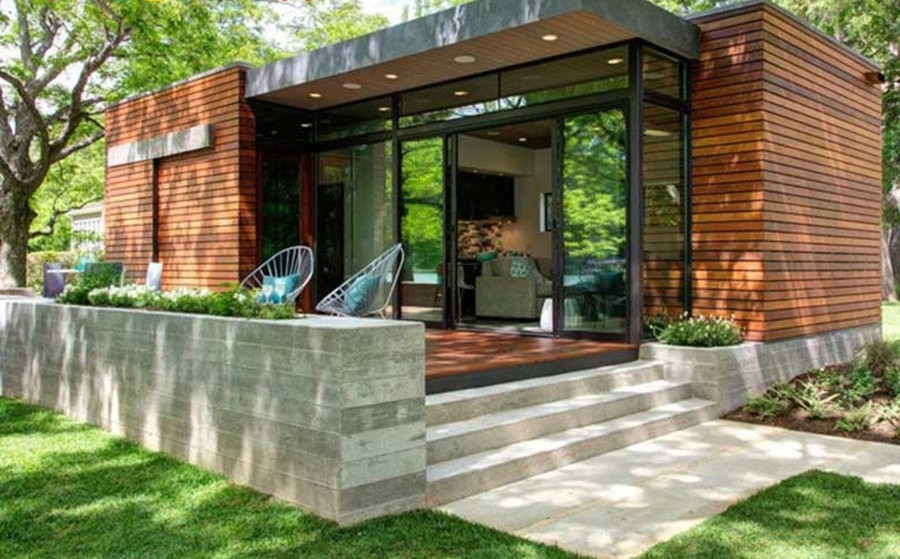 Mẫu nhà mái bằng hiện đại có phần mái hiên đơn giản với các bóng đèn âm tường dẫn vào cửa lớn. Cửa kính lớn phía trước tạo độ thông thoáng cho không gian bên trong. Toàn bộ nội thất trong nhà đều tiết giảm các đường nét, chú trọng vẻ đẹp tối giản. (Ảnh: Musk)