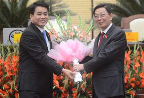 Ngày 10/12, Thủ tướng Chính phủ có quyết định phê chuẩn ông Nguyễn Đức Chung - Phó bí thư Thành ủy Hà Nội, Giám đốc Công an làm Chủ tịch UBND TP Hà Nội nhiệm kỳ 2011-2016. Trong ảnh, Thiếu tướng Nguyễn Đức Chung (trái) nhận lời chúc mừng của người tiền nhiệm Nguyễn Thế Thảo sau khi được HĐND Hà Nội bầu làm Chủ tịch UBND thành phố ngày 4/12 vừa qua. |