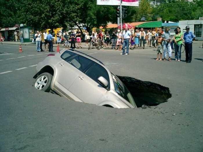 Hố tử thần không phải hiếm gặp. Kỳ khôi ở chỗ chiếc SUV chạy vào địa điểm dành cho người đi bộ và gặp xui.
