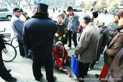 | Tháng 1/2010, một cụ già ở Thâm Quyến ngã xuống đường, cảnh sát và người qua đường không ai chịu ra tay cứu giúp. Hơn 20 phút sau, một bé trai đã nhìn thấy ông cụ nằm bất động trên đường, đầu chảy nhiều máu, ông cụ đã tắc thở. |