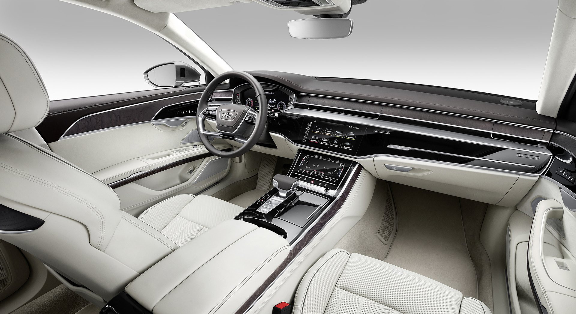 Nội thất A8 đi theo xu thế tiết giảm nút bấm và thay bằng giao diện tương tác thông minh với màn hình cảm ứng. Vô-lăng đa chức năng, đèn chiếu sáng nội thất.