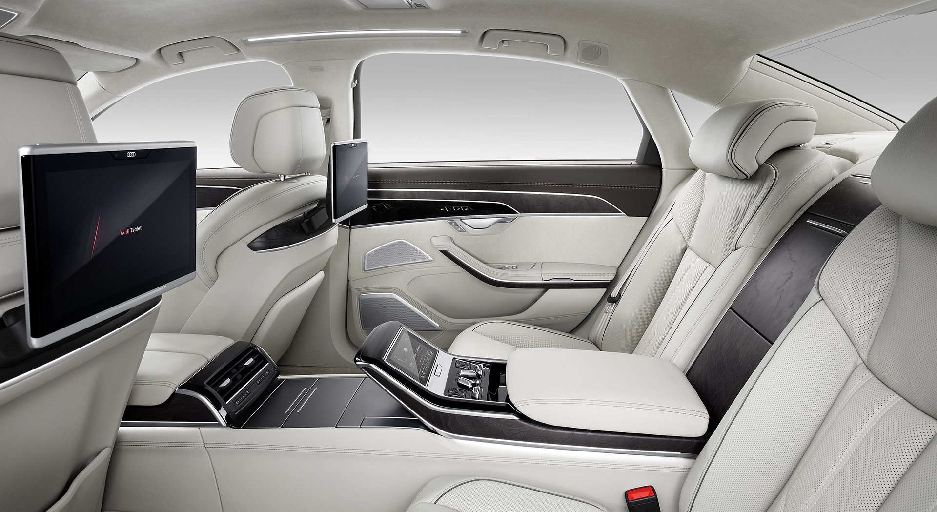 Không gian hàng ghế sau dành cho ông chủ trên bản A8 L có khoảng để chân rộng hơn, màn hình điều khiển cảm ứng đặt nghiêng. Tính năng massage chân cũng là một điểm mới trên mẫu sedan đầu bảng của Audi.