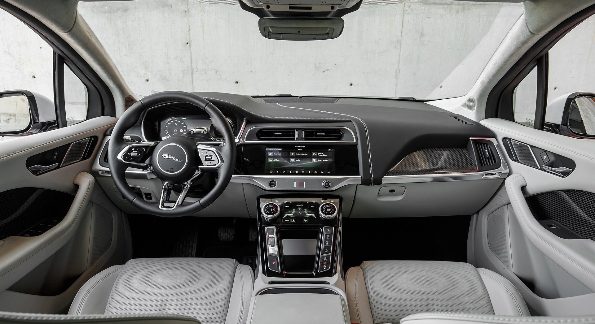 I-Pace là mẫu xe chạy điện hoàn toàn đầu tiên của Jaguar. Thiết kế nội thất lấy cảm hứng từ Range Rover, màn hình cảm ứng kép Touch Pro Duo. Hãng xe Anh quốc sử dụng nhiều chi tiết bằng da, gỗ và nhôm. Bảng điều khiển trung tâm tối giản, ghế da phong cách thể thao.