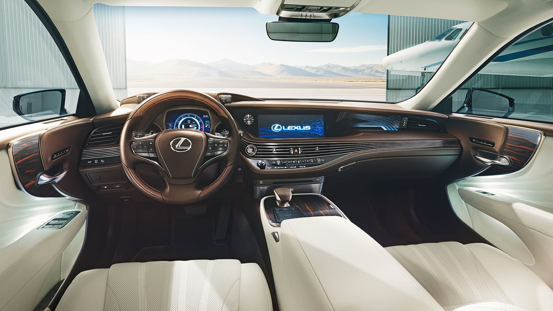 Lexus sử dụng da và gỗ quý cho nội thất của LS 500, bảng điều khiển thiết kế sang trọng, tô điểm với những đường vân nổi chạy ngang. Màn hình cảm ứng cỡ lớn 12,3 inch cho hệ thống thông tin giải trí. Tùy chọn màn hình HUD siêu rộng 24 inch. Bảng điều khiển trung tâm cảm ứng, vô-lăng bọc da và gỗ.