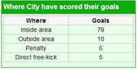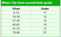 Quãng 15 phút đầu và cuối mỗi hiệp là lúc mà Man City thường xuyên ghi bàn nhất. Trong 15 phút đầu mỗi hiệp, họ đã có tới 36 bàn. Con số này ở 15 phút giữa hiệp chỉ là 25, nhưng lại tăng cao bất ngờ ở 15 phút cuối hiệp với 39 bàn. Điều đó đã chứng tỏ đội bóng thành Manchester rình rập và chắt chiu cơ hội tốt đến như nào.
