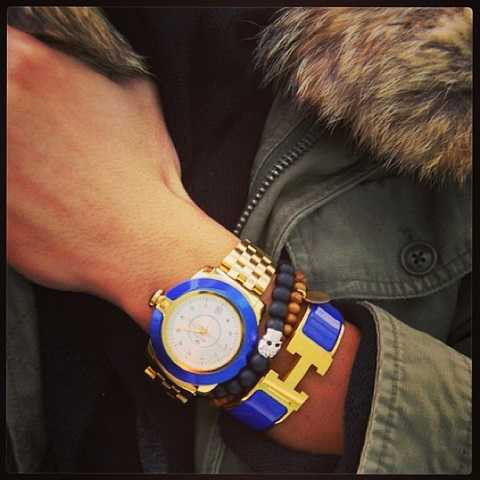 | Phong cách ton-sur-ton giữa đồng hồ và vòng tay càng làm tăng sự chú ý vào chiếc cổ tay của bạn. |