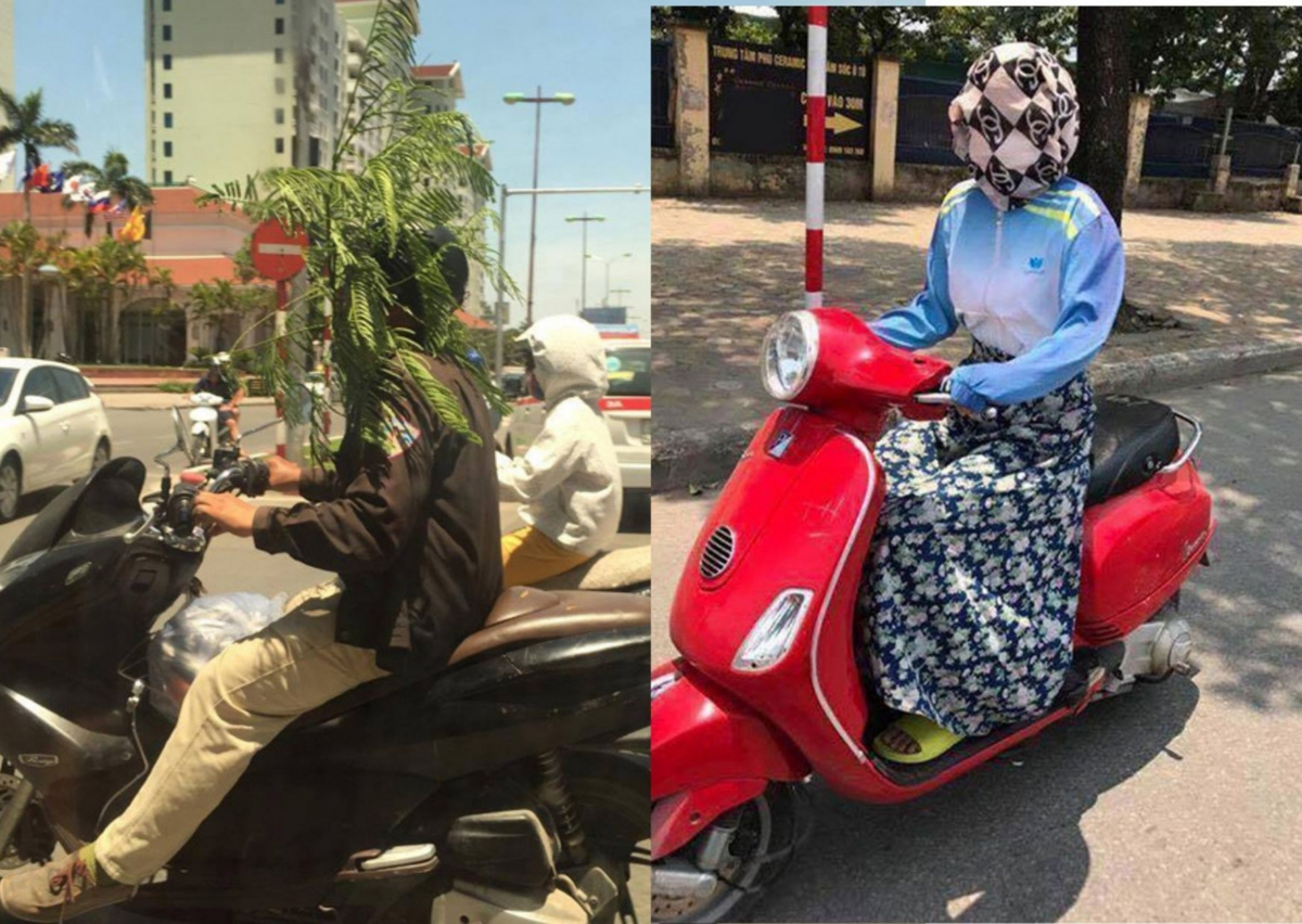 Khẩu trang, váy chống nắng các kiểu vẫn chưa đủ, thêm cây dù bên trên cho mát.