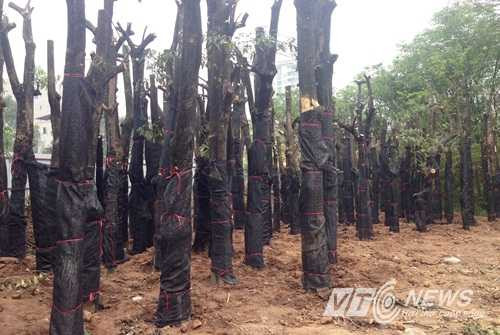 Toàn bộ thân cây được bọc bằng bao dứa màu đen và chăm tưới thường xuyên. Một số công nhân cho biết, làm như vậy là để giữ ẩm cho cây, kích thích quá trình sinh trưởng. Những cây này sẽ được mang đi trồng bổ sung ở các vị trí khác khi đã phát triển ổn định
