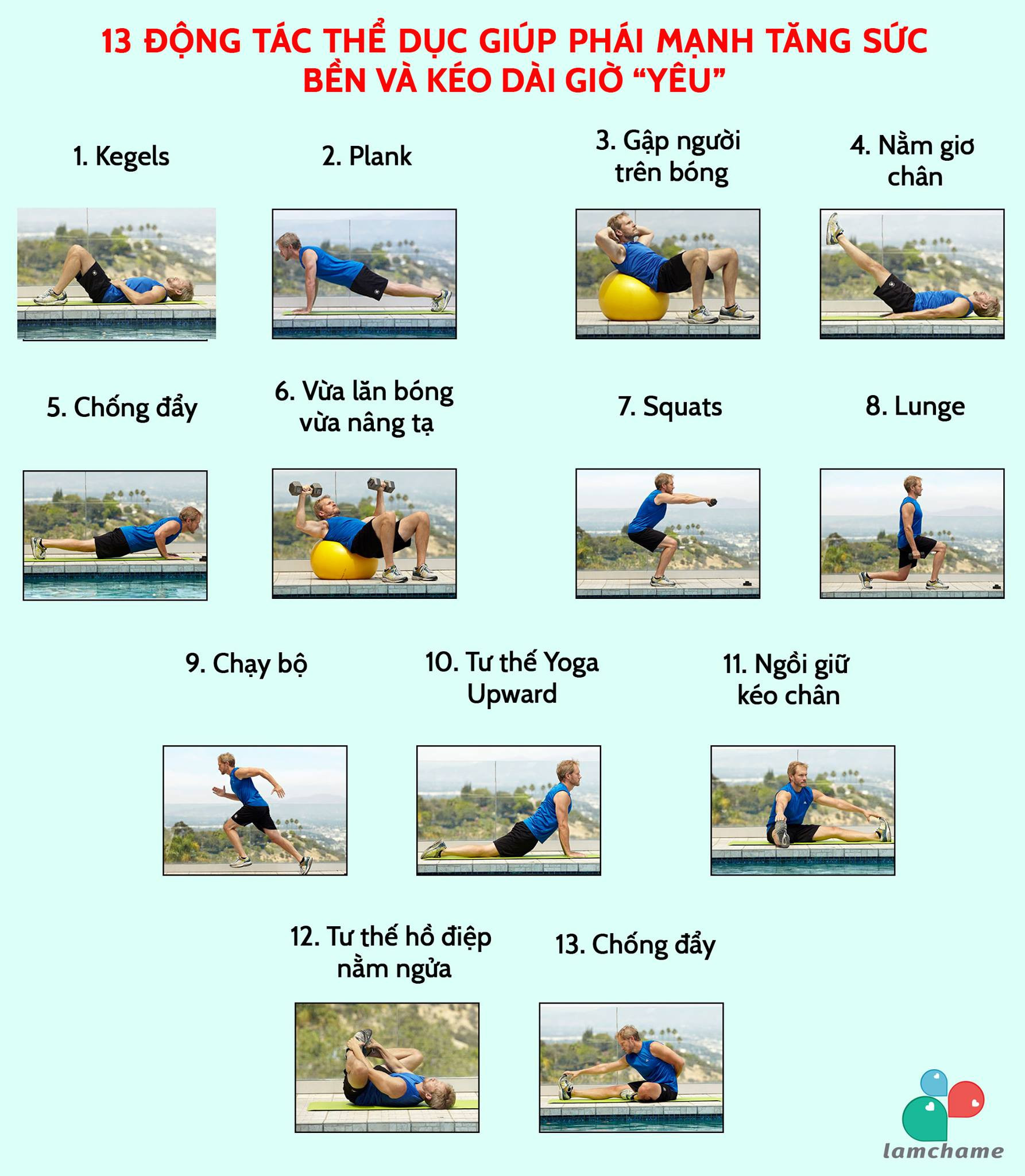 Nhưng vấn đề này không phải khó đến mức bó tay nếu đấng mày râu sớm biết đến 13 động tác tập luyện tăng cường sức khỏe sinh lý này. Theo chuyên gia, các động tác như Plank, Lunge, chạy bộ, Yoga….không chỉ giúp phái mạnh nhanh chóng lấy lại sức bền, kéo dài thời gian lâm trận, khắc phục nhược điểm của cơ thể do tuổi tác hay áp lực, căng thẳng từ cuộc sống mà còn đem đến những cơn cực khoái bất ngờ đầy thăng hóa.