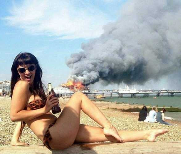 Vui đùa khi thấy tai nạn: Bên cạnh những kiểu chụp ảnh với quan tài, xác chết... tạo dáng khi trông thấy người khác gặp tai nạn, trước đám cháy cũng được đánh giá là rất phản cảm. Mặc dù vậy, các tấm hình dạng này vẫn thường xuyên được giới trẻ chia sẻ trên mạng. Có thể thấy như Louisa Foley (cô gái trong ảnh). Louisa tự tin mặc bikini uốn éo, thể hiện rõ sự phấn khích dù biết đằng sau mình là đám cháy rất lớn tại bến tàu Eastbourne (Anh). (Ảnh: Daily Mail)