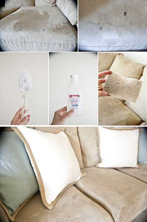 Để làm sạch ghế sofa bọc vải, đặc biệt là vải nhung, vải da lộn, vải lông tuyết, các mẹ cần đến một miếng bọt biển màu trắng (loại không phai màu) và cồn. Đổ cồn vào trong bình xịt và xịt đều lên bề mặt vải cần làm sạch. Sau đó, dùng bọt biển chà sạch. Để khô tự nhiên.