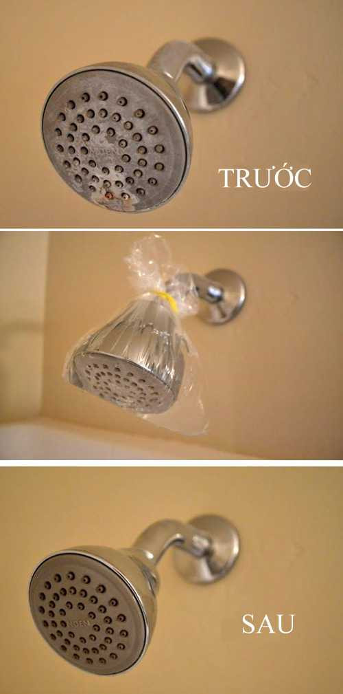 Để làm sạch bầu sen của vòi tắm, các mẹ chuẩn bị giấm trắng và một chiếc túi ni-lông. Đổ giấm vào túi và buộc nó quanh phần bầu sen, ngâm trong 1 giờ đồng hồ. Sau đó, rửa sạch với nước. Em thấy cách này vui vui và sáng tạo ghê.