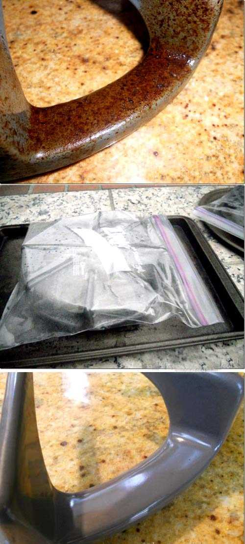 Đổ 1/4 chén amoniac vào một chiếc túi ni-lông, cho kiềng bếp bẩn vào trong túi, buộc kín lại và để qua đêm. Sáng hôm sau, dùng một miếng bọt biển hoặc giẻ cọ sạch, rửa lại với nước và để ráo. Các mẹ sẽ bất ngờ vì không còn lại một chút dấu vết dầu mỡ nào.