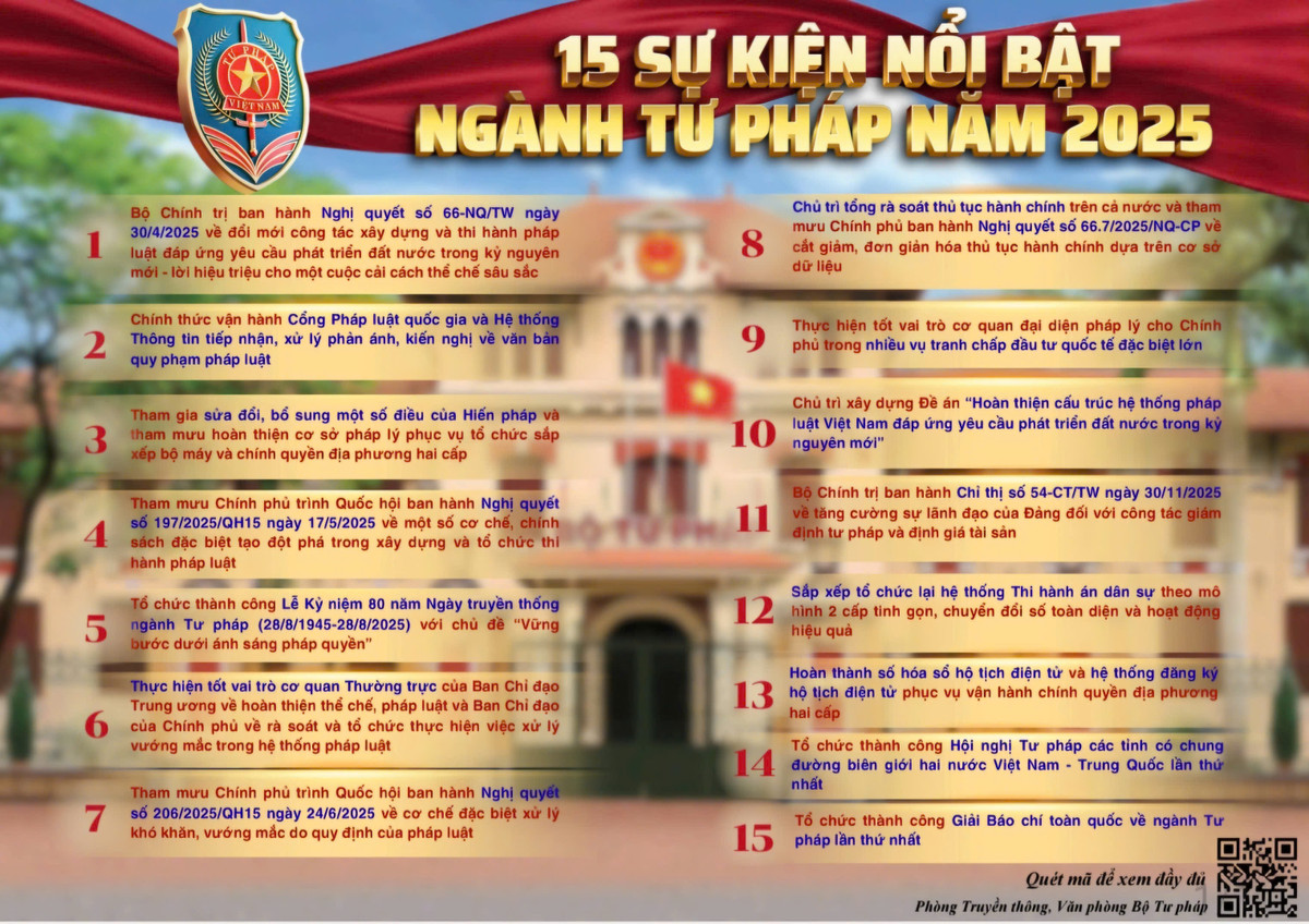 15 sự kiện nổi bật năm 2025 đã phác họa rõ nét một năm bản lề, thể hiện vai trò tiên phong của ngành Tư pháp trong cải cách thể chế, xây dựng và hoàn thiện Nhà nước pháp quyền xã hội chủ nghĩa, tạo nền tảng pháp lý vững chắc cho sự phát triển nhanh và bền vững của đất nước.