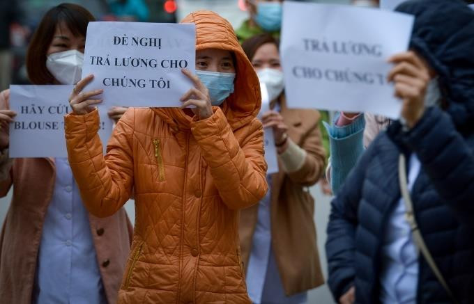 Nhân viên y tế Bệnh viện Tuệ Tĩnh đòi tiền lương. (Ảnh: Đắc Huy)