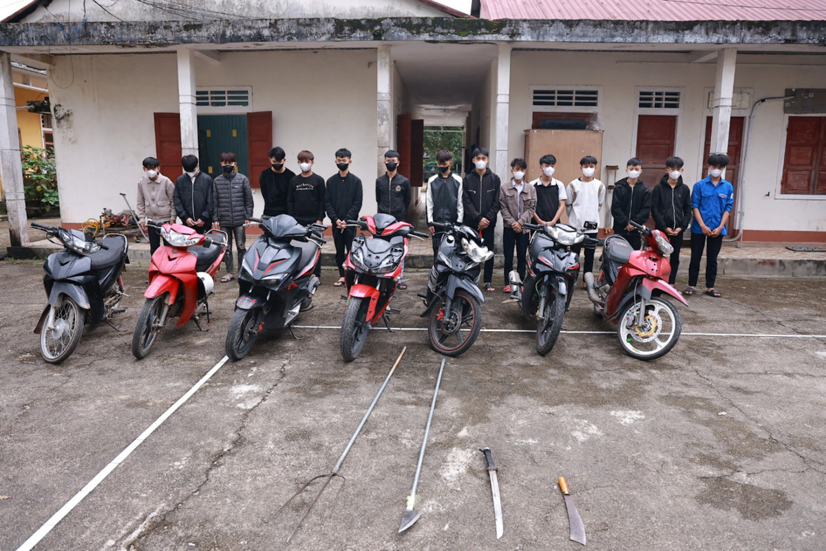 Bằng các biện pháp nghiệp vụ, khoảng hơn 0h ngày 06/12 Đội Cảnh sát ĐTTP về Hình sự - Kinh tế - Ma túy Công an huyện Hải Lăng phát hiện trên tuyến đường 3/2 thuộc thị trấn Diên Sanh (huyện Hải Lăng) có 16 thanh thiếu niên mang theo dao phóng lợn, vỏ chai bia và một số hung khí thô sơ, di chuyển trên 07 xe mô tô, không đội mũ bảo hiểm, chạy tốc độ cao, dàn hàng ngang…