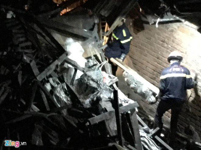 Cơ quan chức năng phát hiện 2 thi thể trong đống đổ nát sau vụ cháy. (Ảnh: Trần Anh)