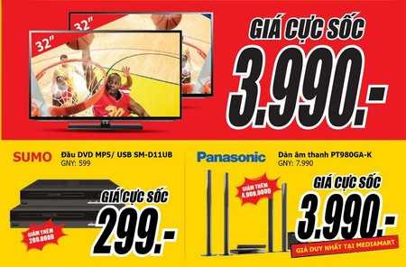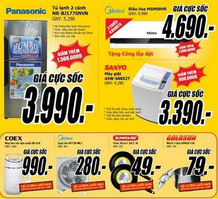 Có thể kể đến: tủ lạnh 2 cánh NR-BJ177SNVN giảm 1,3 triệu còn 3.990.000đ, điều hòa 2 chiều 9000BTU Midea MSM09HR giảm 1,3 triệu còn 4.690.000đ tặng công lắp đặt, máy giặt Sanyo ASW-S68X2T giảm 900.000đ còn 3.390.000đ…