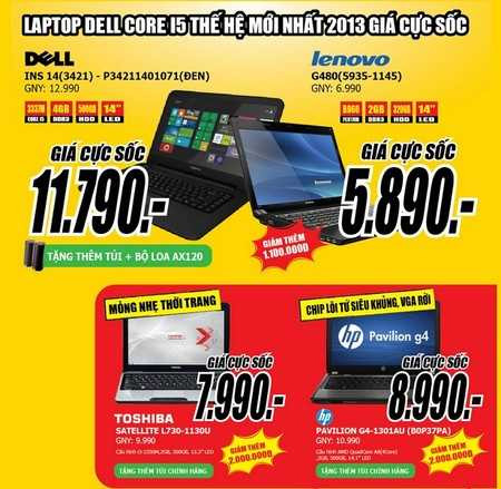 Đến với Media Mart vào thứ 4 ngày 17/4, các tín đồ công nghệ không thể bỏ qua Dell Ins 14(3421) core i5 giá 11.790.000đ tặng túi và bộ loa, Lenovo G480 Pentium P960 giảm 1,1 triệu còn 5.890.000đ, Toshiba Satelite L730-1130U giảm 2 triệu còn 7.990.000đ…