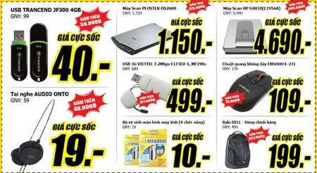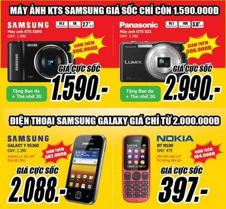 Cũng trong Ngày cao điểm đại hạ giá này máy ảnh KTS Samsung ES90 giá chỉ 1.590.000đ tặng bao da, thẻ nhớ 2G ; máy ảnh KTS Panasonic SZ1 giá 2.990.000đ tặng bao da, thẻ nhớ 2G, Samsung Galaxy Ý S5360 giá 2.088.000đ, Nokia N100 giá 397.000đ…