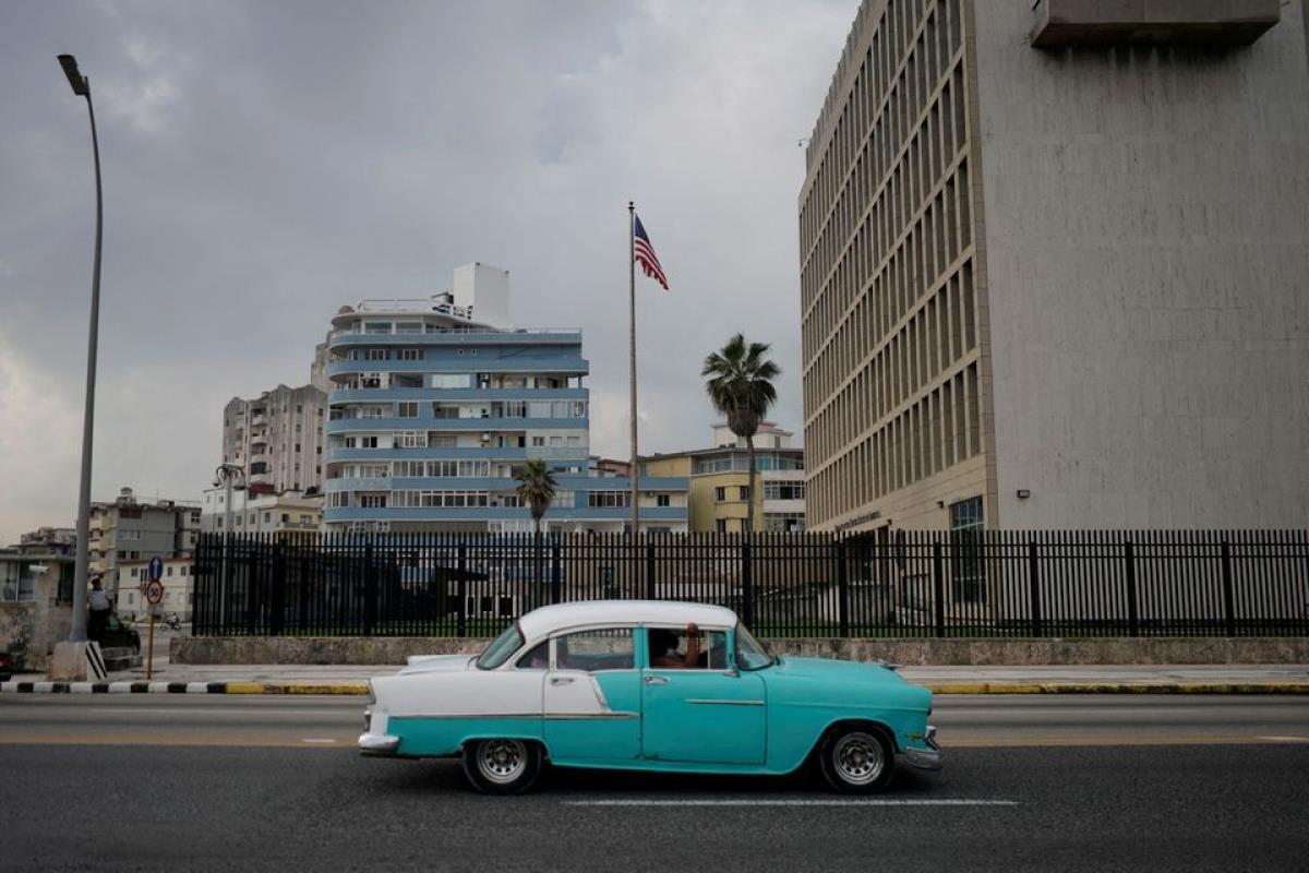 Một chiếc ô tô cổ băng qua Đại sứ quán Mỹ ở thủ đô La Habana, Cuba, ngày 30/10/2020. (Ảnh: Reuters)
