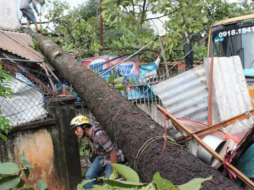 | Cây dầu dài hàng chục mét ngã đè lên mái nhà người dân tại Bình Dương vào chiều 4/9 - Ảnh: Đỗ Trường/TNO |