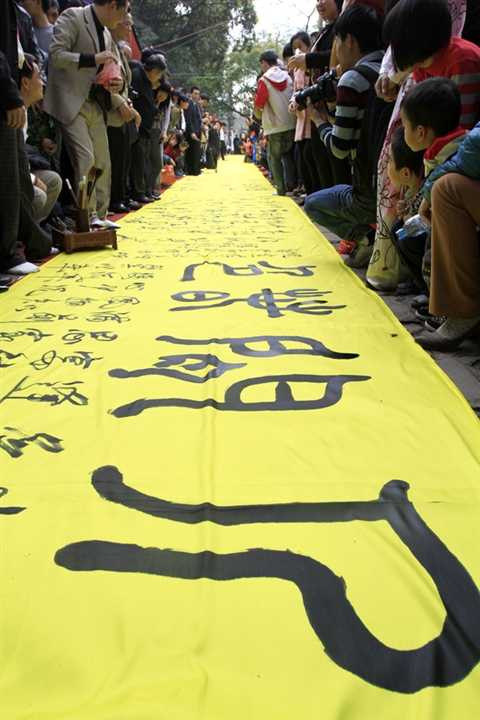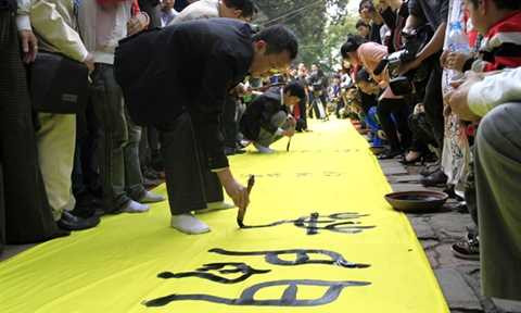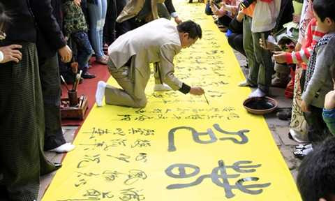 Chiều 24/2, bên phố Giám, nhóm Thư pháp trẻ miền Bắc cùng nhau trình diễn thư pháp, mang đến những nét bút nét chữ khoáng hoạt trên dải lụa dài 50m. |