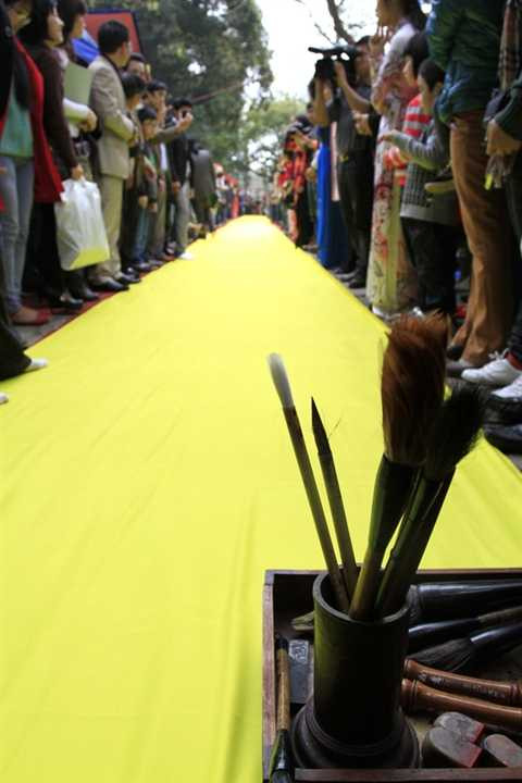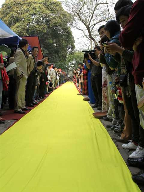 | Dải lụa để các nhà thư pháp trẻ thể hiện dài 50m, trải dài theo phố Giám |