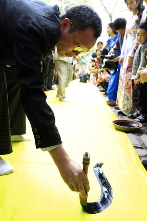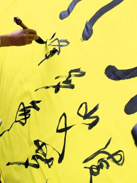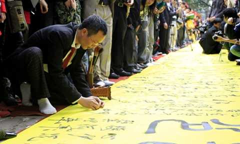 | Các thư pháp trẻ phóng bút trên dải lụa. |