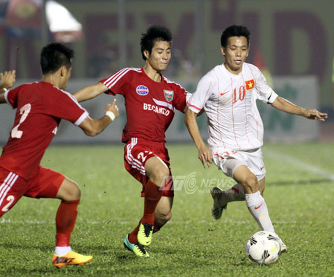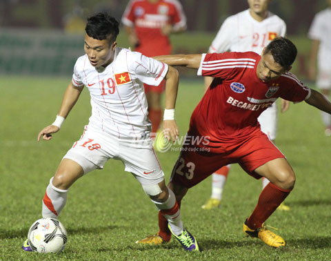 50' KHÔNG VÀO... Từ cánh phải, Quang Hùng tạt bóng vào cho Văn Thắng. Tiền vệ người Thanh Hóa làm động tác giả đánh lừa trung vệ Minh Đức như ở cú sút sau đó, anh không đánh bại được Tấn Trường.