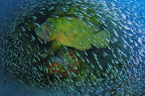 "Vào một ngày lộng gió ngay sau khi một cơn bão đi qua phía bắc của Great Barrier Reef, cảnh đại dương lúc đó vô cùng khác thường. Chưa bao giờ tôi nhìn thấy nhiều cá thủy tinh 'Bommie' ở những rặng san hô đặc biệt như thế này. Đây là một bức ảnh thật khó có thể chụp được”.