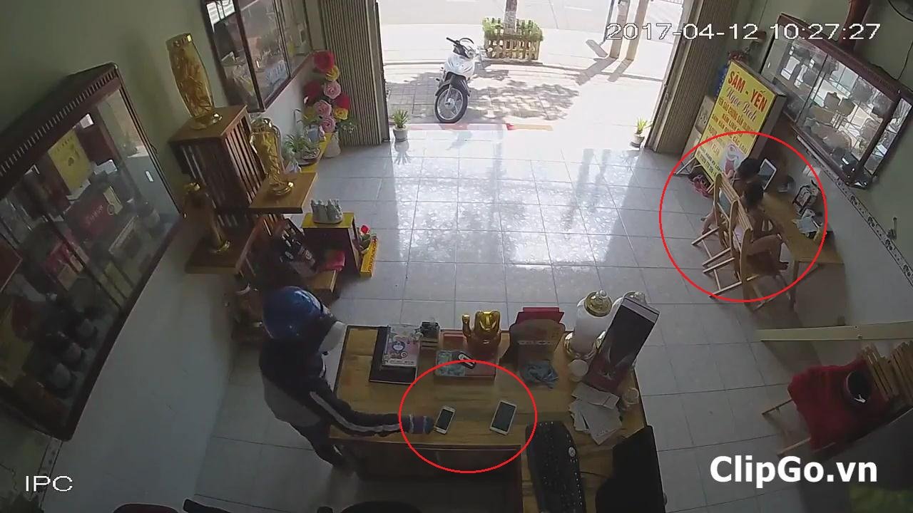 Thấy 2 bé gái đang mải chơi iPad, cửa hàng không ai trông coi, người phụ nữ đội mũ bảo hiểm, đeo khẩu trang vào thẳng bàn làm việc lấy 2 chiếc điện thoại.