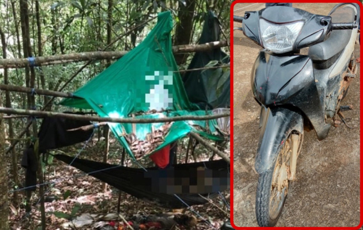 Tại hiện trường, có 1 võng dù màu xanh, nhiều vật dụng khác như áo mưa cánh dơi, mũ bảo hiểm, dao, bật lửa, túi xách. Trong túi có nhiều loại thuốc như thuốc đau bụng, giảm đau, dây cước, lưỡi câu, bật lửa, gạo, hồ tiêu, tép khô.