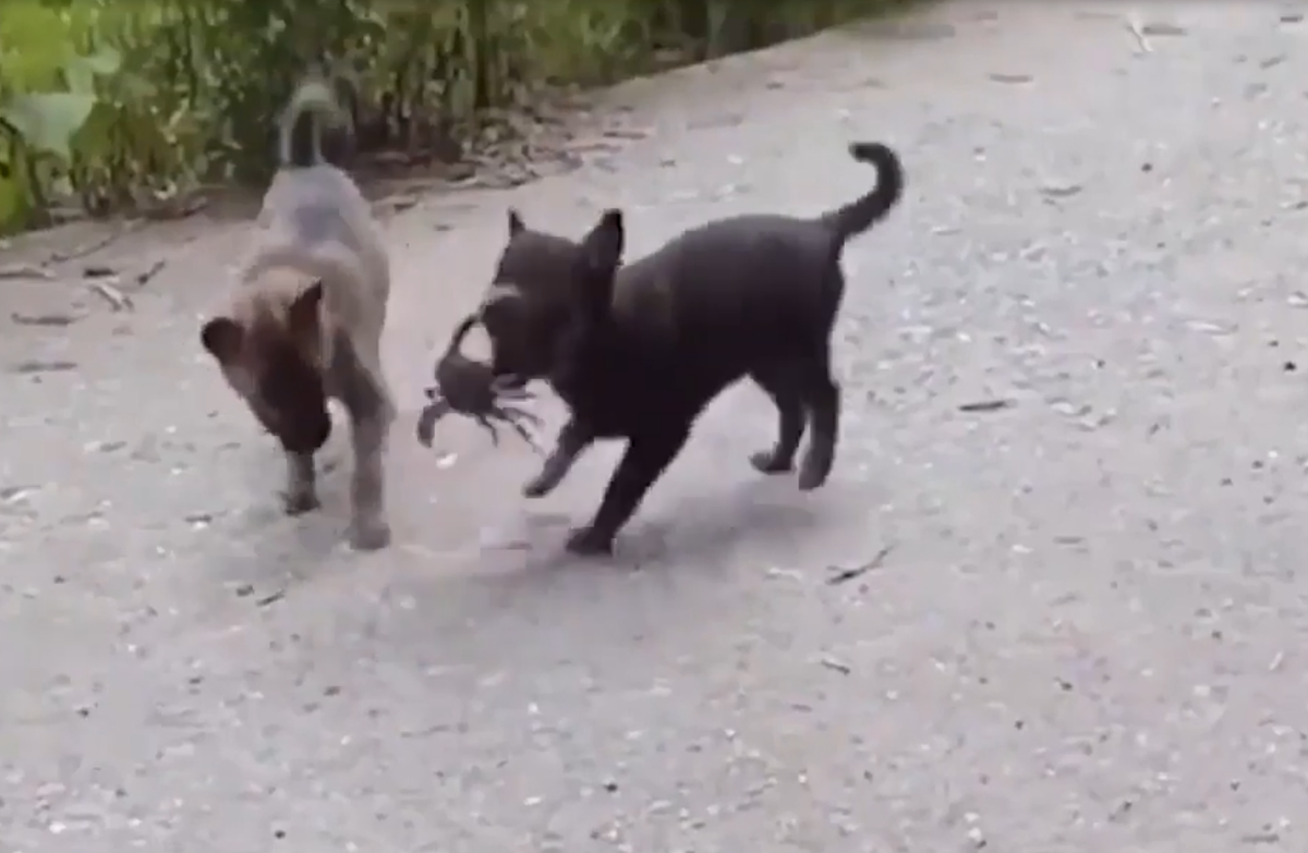 Hai chú cún nghịch ngợm, tranh nhau ngoạm con cua, để rồi hết lần này đến lần khác bị cua kẹp vào mõm, kêu rên thảm thiết.