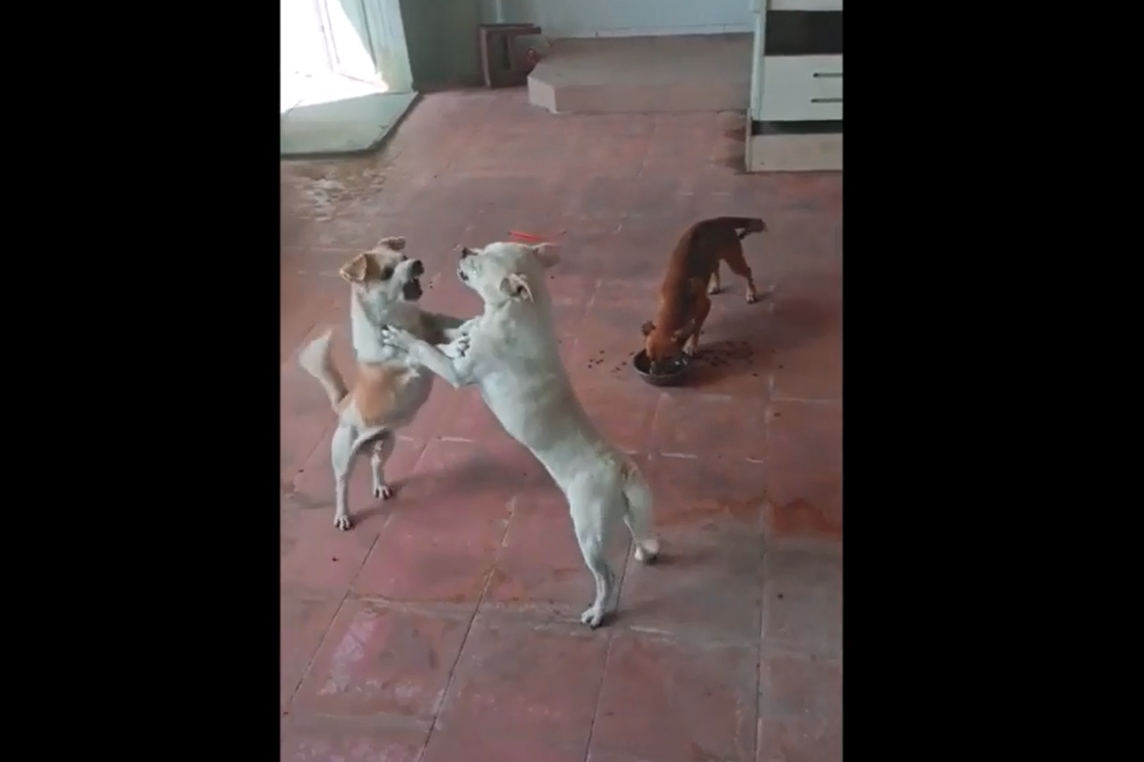 2 con chó mải đánh nhau, để 'kẻ thứ 3' chén sạch đồ ăn