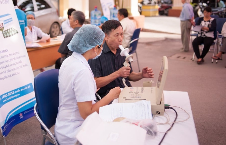 Nhân viên y tế Bệnh viện Phổi Hà Nội khám sàng lọc bệnh cho người dân.
