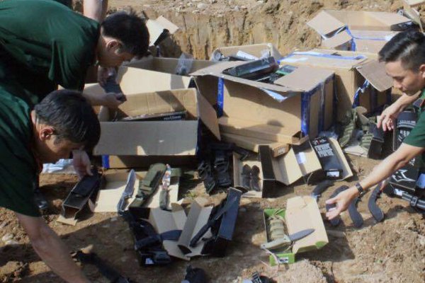 Sáng 10/5, Đồn Biên phòng Bắc Sơn (Bộ Chỉ huy Biên phòng Quảng Ninh) vừa tiến hành tiêu hủy 13 thùng 'hàng nóng', chứa hơn 300 chiếc dao găm các loại.