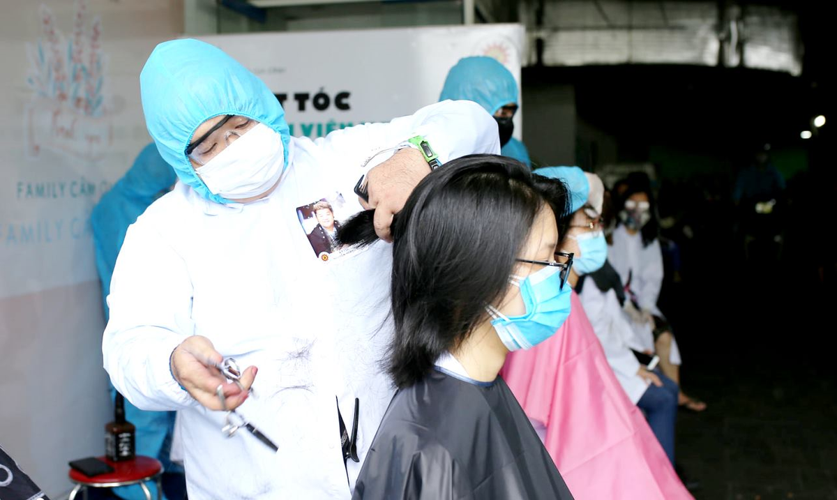 Y bác sỹ Bệnh viện Đa khoa Gia đình cắt tóc để chống dịch.