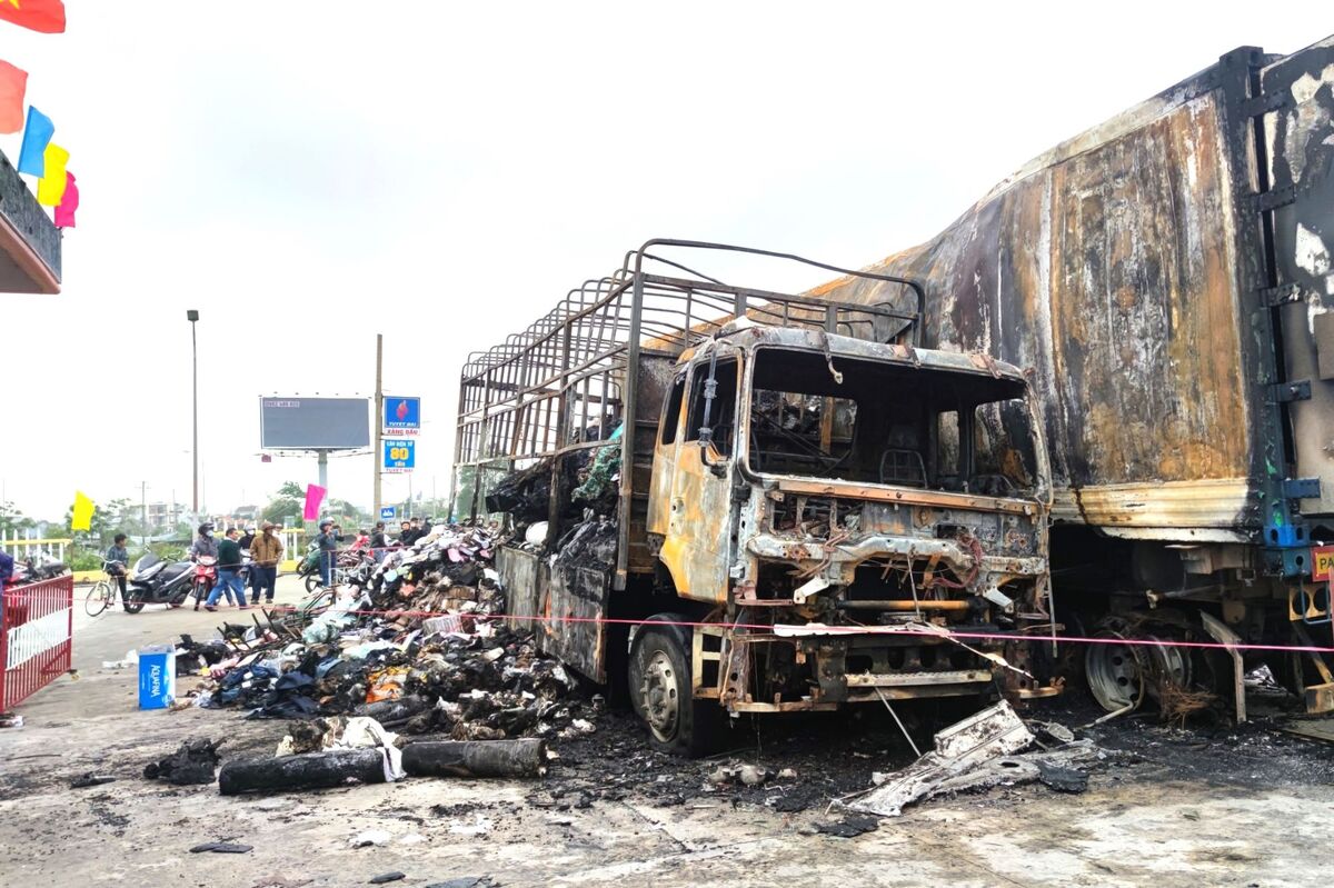 Xe tải của ông Bảo cùng toàn bộ hàng hóa cháy rụi hoàn toàn, xe container hư hỏng nặng nhưng may mắn không thiệt hại về người.