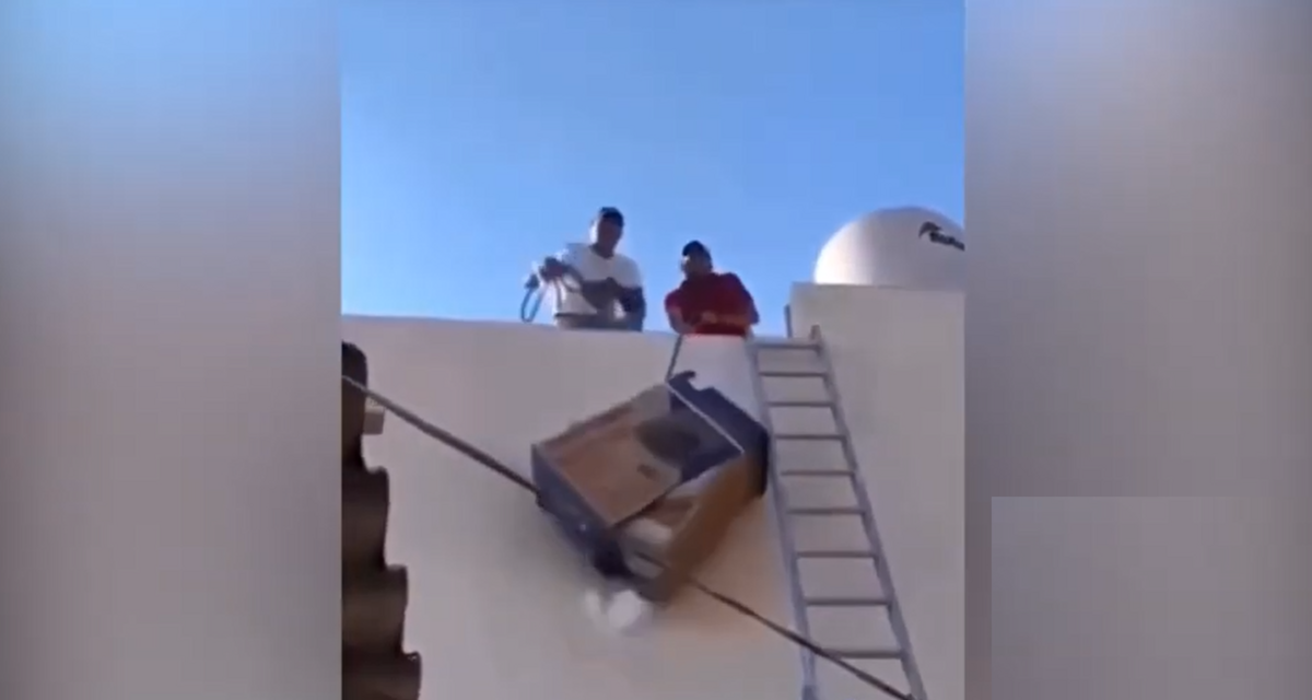 Chiếc máy điều hòa được 2 thanh niên kéo gần lên được mái nhà thì bất ngờ bị đứt dây và rơi xuống đất vỡ tan tành.