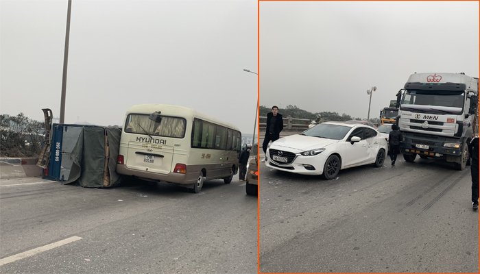 Vào khoảng 7h10, xe tải BKS 29C-638.10 đang đi trên cầu Thanh Trì, hướng từ Gia Lâm sang trung tâm TP Hà Nội thì tông vào đuôi xe khách 29 chỗ BKS 29B-095.88. Sau cú va chạm, xe tải bị lật nghiêng.