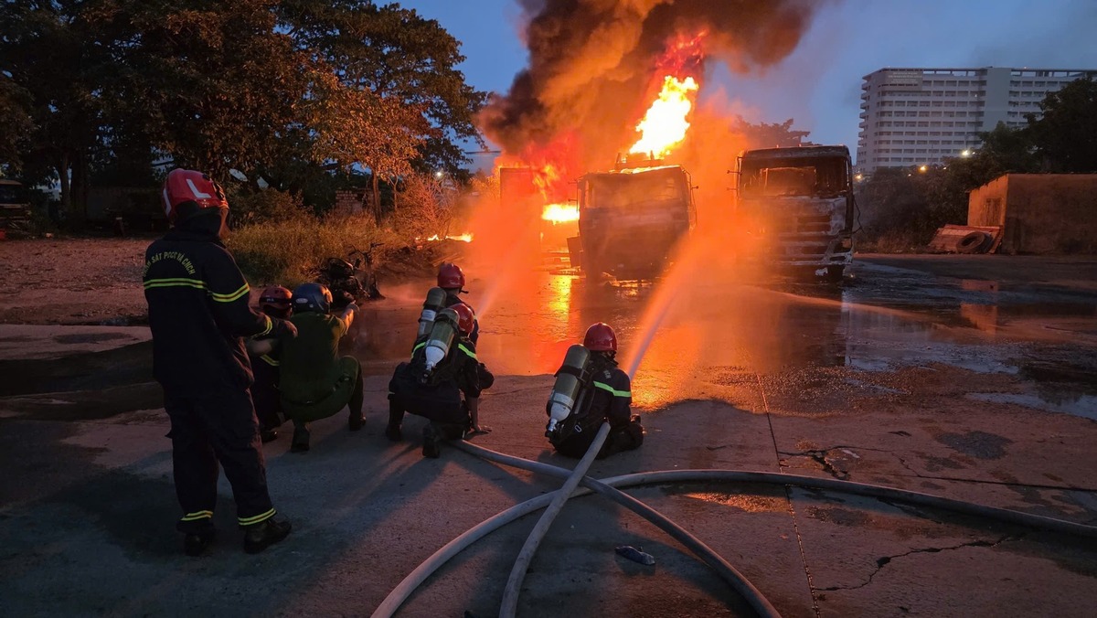 Theo thông tin ban đầu, thời điểm trên, hai xe bồn chở xăng dầu cùng một thùng container chứa các phuy dầu bị lửa bao trùm, khói đen bốc cao nghi ngút.