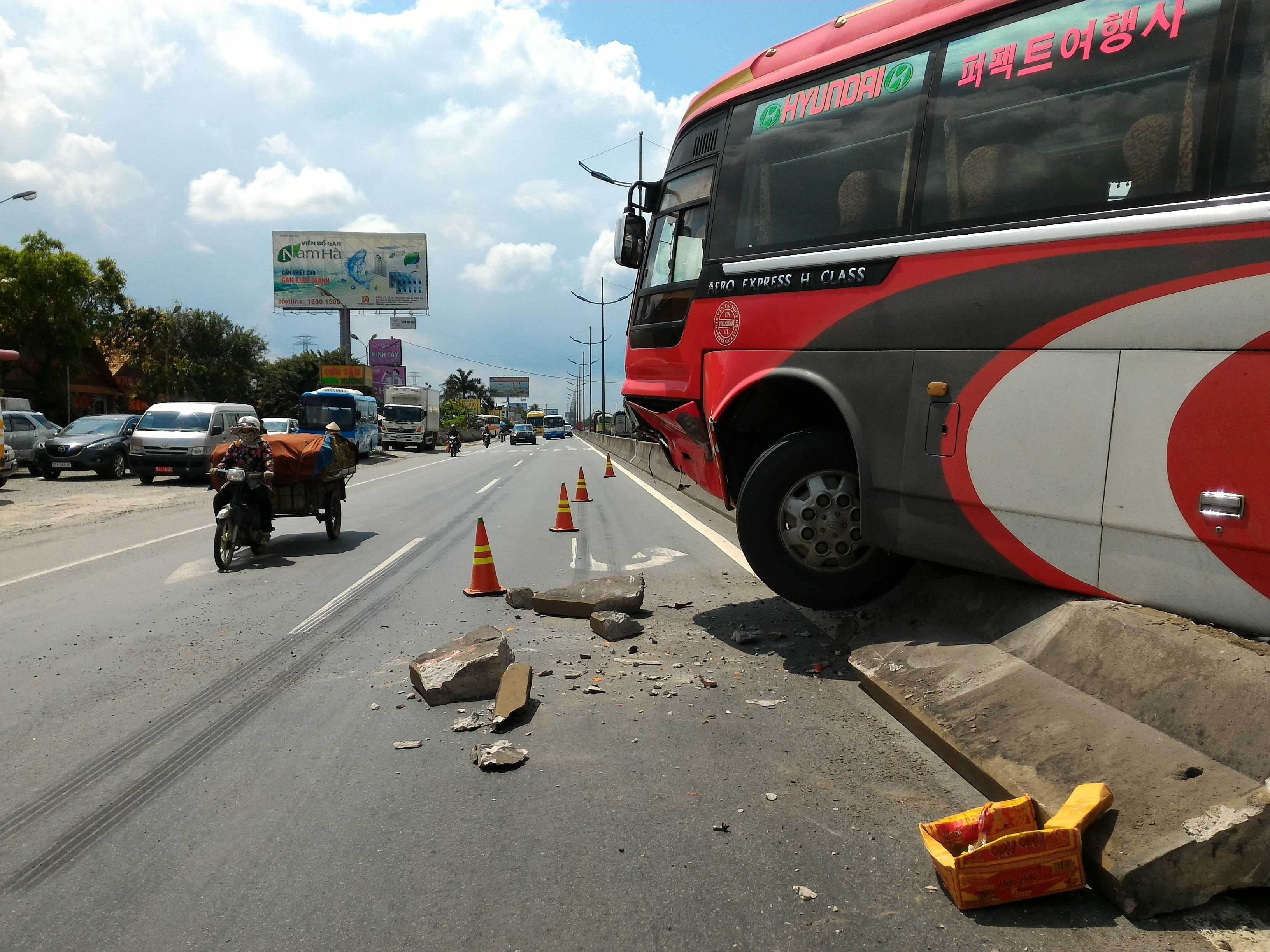 Cú tông mạnh khiến xe khách của tài xế Hiếu lao lên, đâm nát 2 đoạn dải phân cách. Chiếc xe còn lại tiếp tục tông bể nát trụ cột mốc lộ giới trên đường sau đó dừng lại.