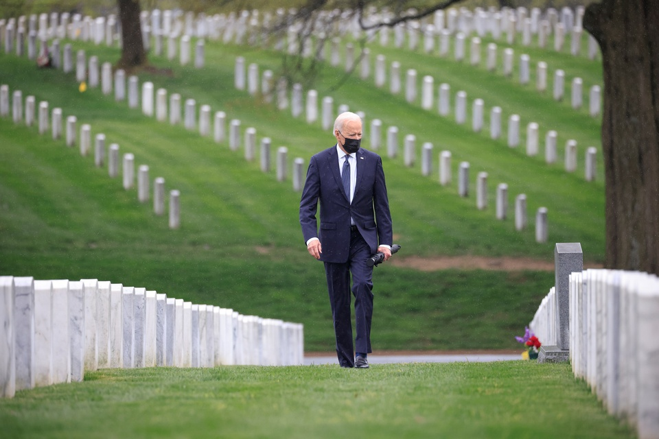 Tổng thống Biden khóc trước mộ của lính Mỹ thiệt mạng trong cuộc xung đột tại Afghanistan khi tới thăm nghĩa trang Quốc gia Arlington sau tuyên bố rút quân. (Ảnh: Reuters)